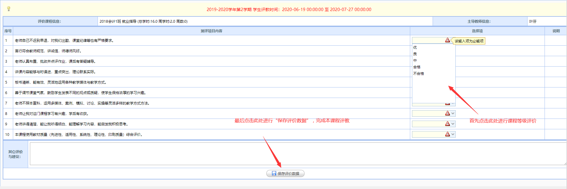 3.点击“三角框(如图)进行课程等级评价”,选好后,点击“保存评价数据”完成这一课程评教。