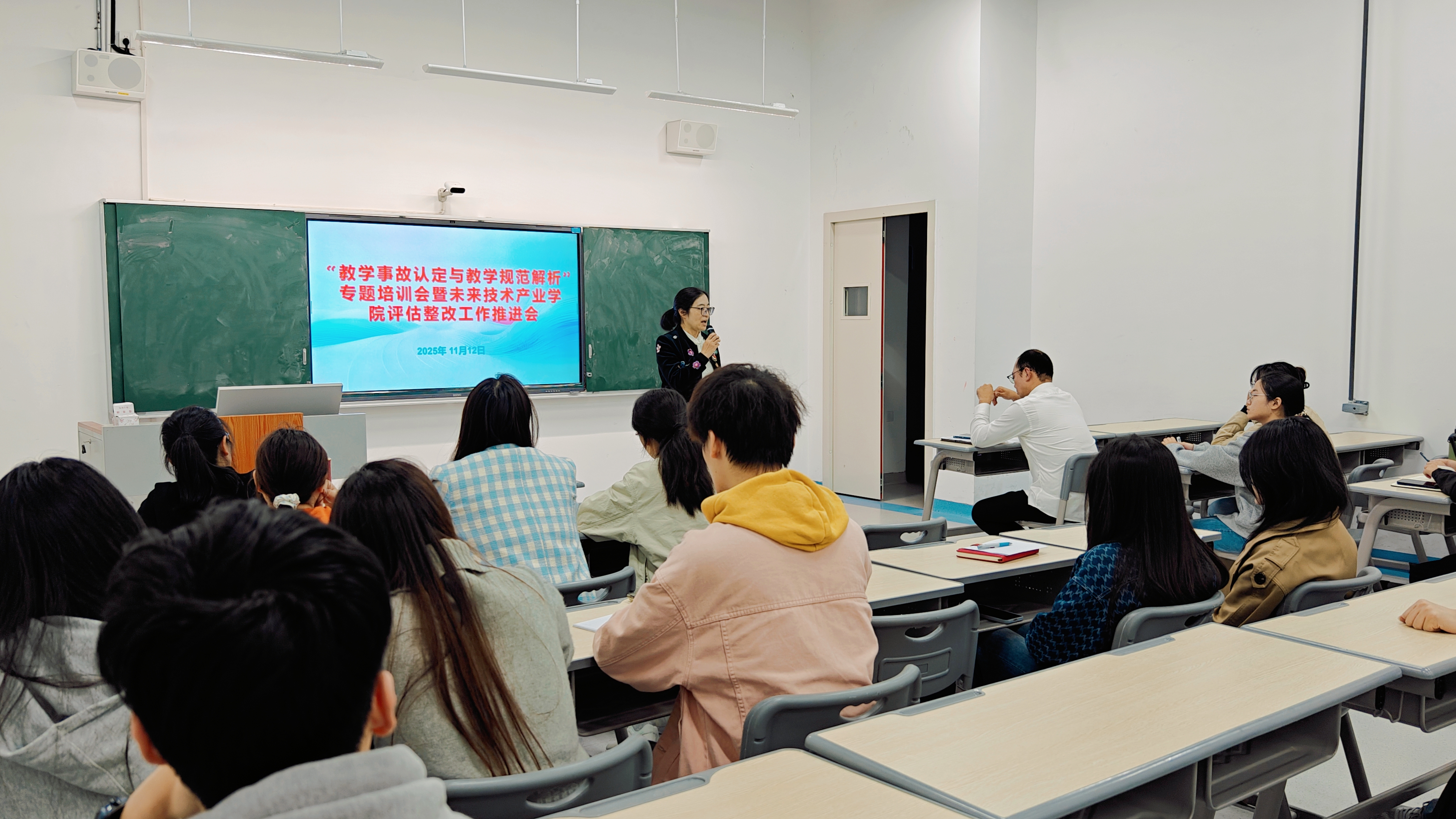 为深入推进二轮整改工作,进一步规范教学管理,明确教学事故认定标准,全面提升教学质量,近日,教学质量管理中心组织召开了教学质量管理二轮整改工作推进会。会议由彭静主任主持,未来技术产业学院校企全体专任教师、兼职教师、教学管理人员参会。