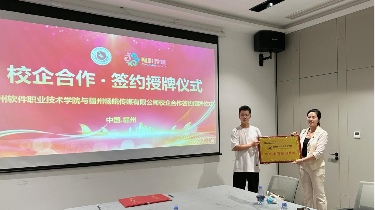 随后,徐颖院长向福州畅眺传媒有限公司授予“校外实习实训基地”牌匾,这不仅是对畅眺传媒在行业领域内实力的认可,更是双方合作的重要里程碑。