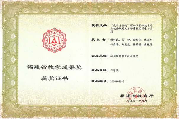 经过多年的实践探索,“设计方法论”驱动软件技术专业产教融合人才培养模式的办学成效逐步显现。软件技术专业校企联动培养模式实施以来,人才培养质量稳步上升,专升本升学率逐步提高(2020 年达到35%)校企联动畅通,尤其受到地方政府、社会和企业的认同和肯定,荣获2020年福建省职业教育教学成果奖两项。