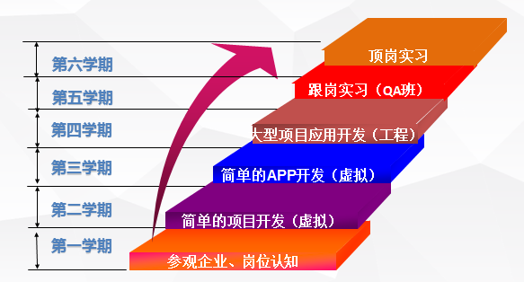 实践课程结构上,设计了从认知实习→课内实验→集中性实践→顶岗实习四级的渐进式过程。实践教学采取了四层深入式,利用大一上的寒假组织学生深入到IT相关企业及岗位参观学习。达到专业认知实习。引入企业专家参与实践教学,包括探讨教学方案、实践指导。采用“2+1”的实践培养模式,利用2年的时间以学校和企业联合进行学科基础课程、专业课程的教学。最后1年的时间进行集中实训实习,与企业充分合作,实行按需定制培养