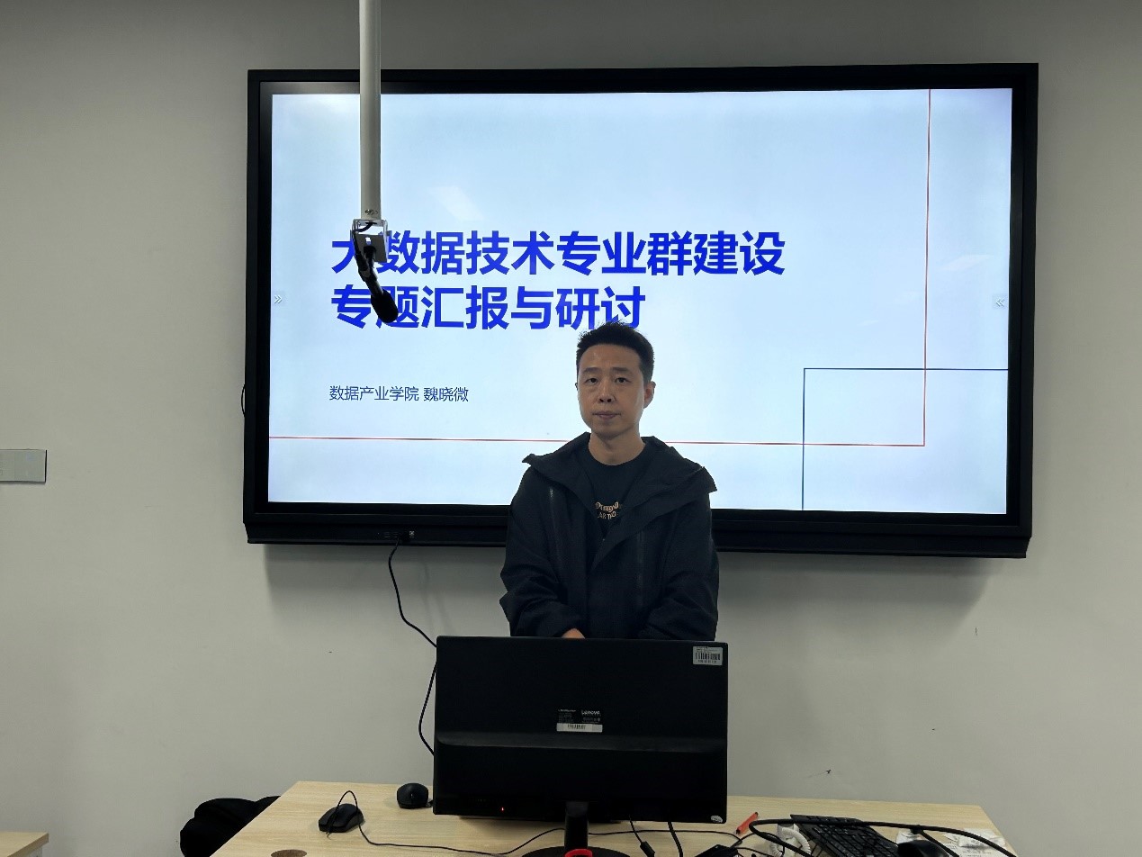 会议由陈庆强院长主持,大数据技术专业群负责人魏晓微老师作报告,报告内容主要涵盖专业群组群逻辑、建设成效、整改回访及未来规划等多个方面,旨在群策群力探索高质量专业群建设路径。